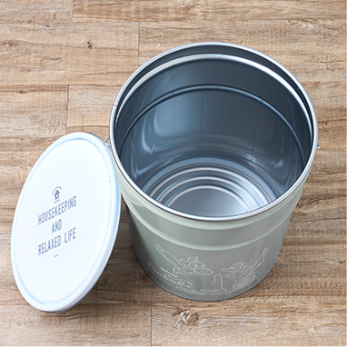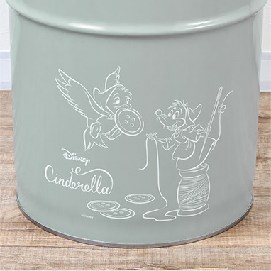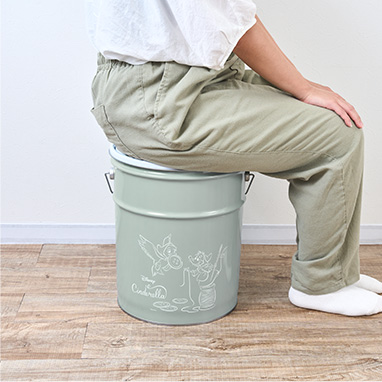 落ち着いたグレーのペール缶スツールに、シンデレラの、オリジナル描き下ろしイラストをデザインしました。蓋を閉めると座ることができるので、ガーデニングなどさまざまな作業にピッタリ。