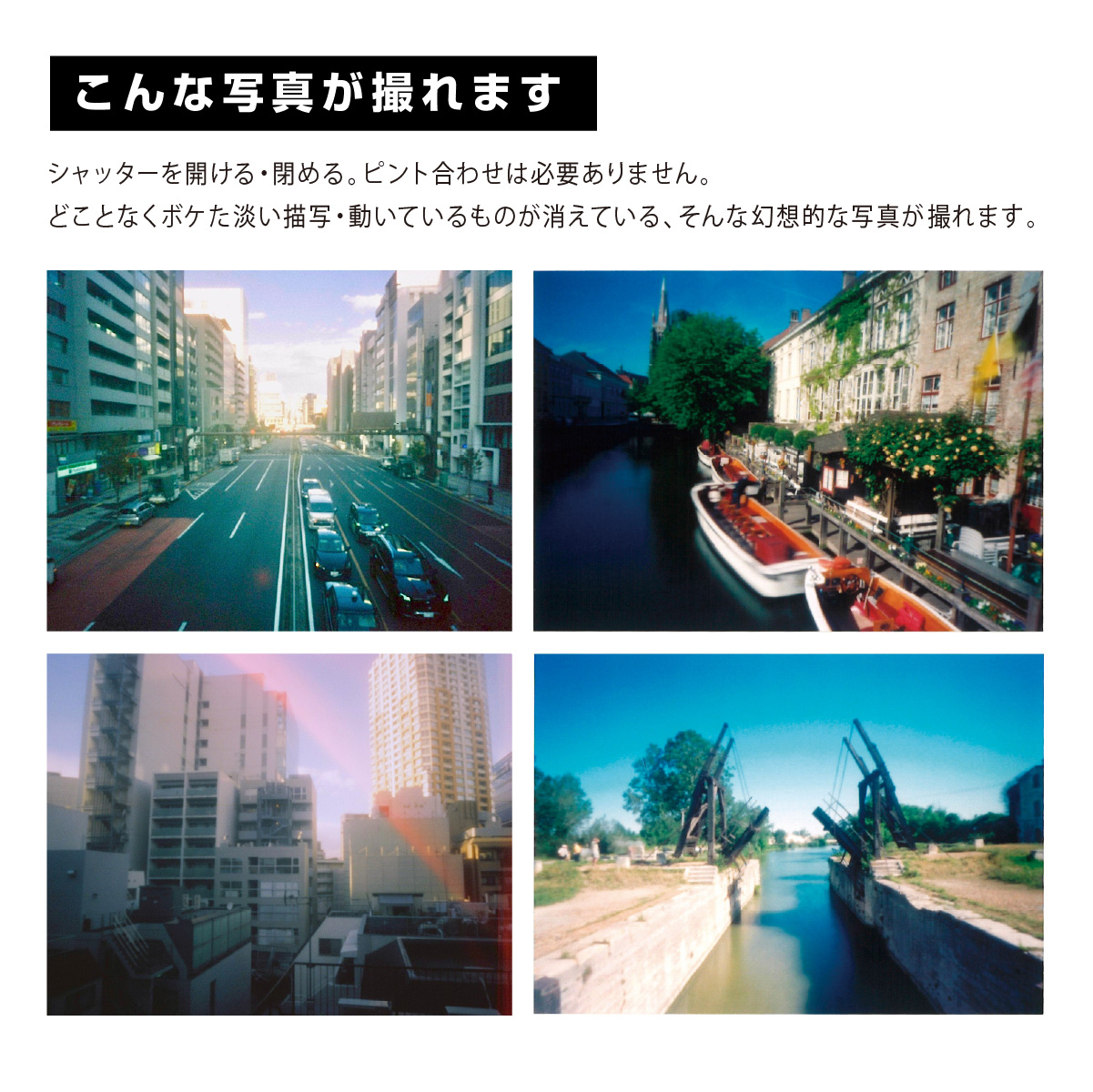 | 製品仕様 | 対応フィルム:35mmフィルム 焦点距離:20mm ピンホール径:0.16mm F値:F/130 寸法:W110mm×H70mm×D32mm 質量:75g※フィルムは含まれません 組み立て時間の目安:約60分 ※工具不要 |